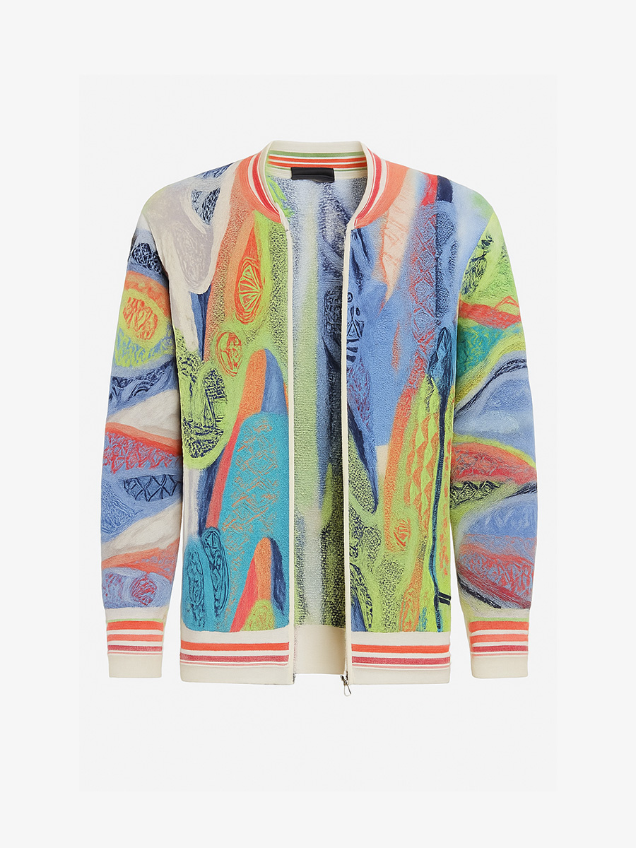 Het vest is uitgevoerd in een levendige mix van blauw, limegroen, oranje, rood en crèmetinten, gecombineerd in een typisch 3D-breipatroon waar Carlo Colucci om geroemd wordt. De bomberstijl–boord bij de hals, mouwen en onderzijde zorgt voor een moderne, sportieve uitstraling, terwijl de hoogwaardige knit afwerking het geheel een luxe uitstraling geeft.