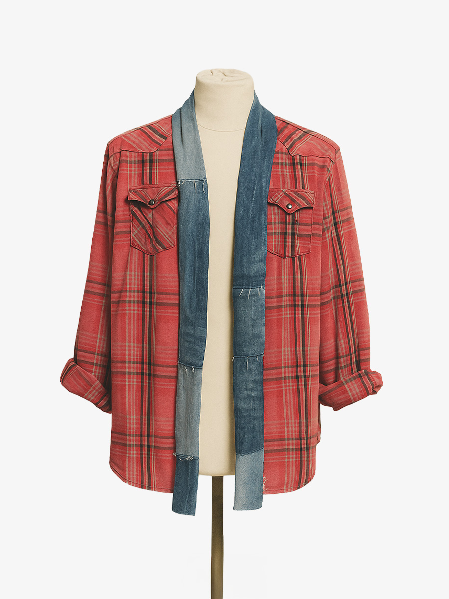 Een uniek kimono-achtig jasje, vervaardigd uit premium upcycled denim, een vintage overhemd en een originele Kantha-stof uit de jaren ’70. Ontworpen voor lente, zomer en herfst. Een combinatie van high fashion, moeiteloos draagcomfort en uitgesproken individualiteit.